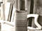 Evenwicht, H. 45 cm., 2 blokken bijeengehouden door een leren band., teak, 1981